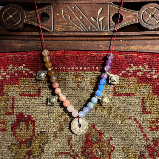 gemstone necklace "magical talisman" | antique japanese 1939 sen coin